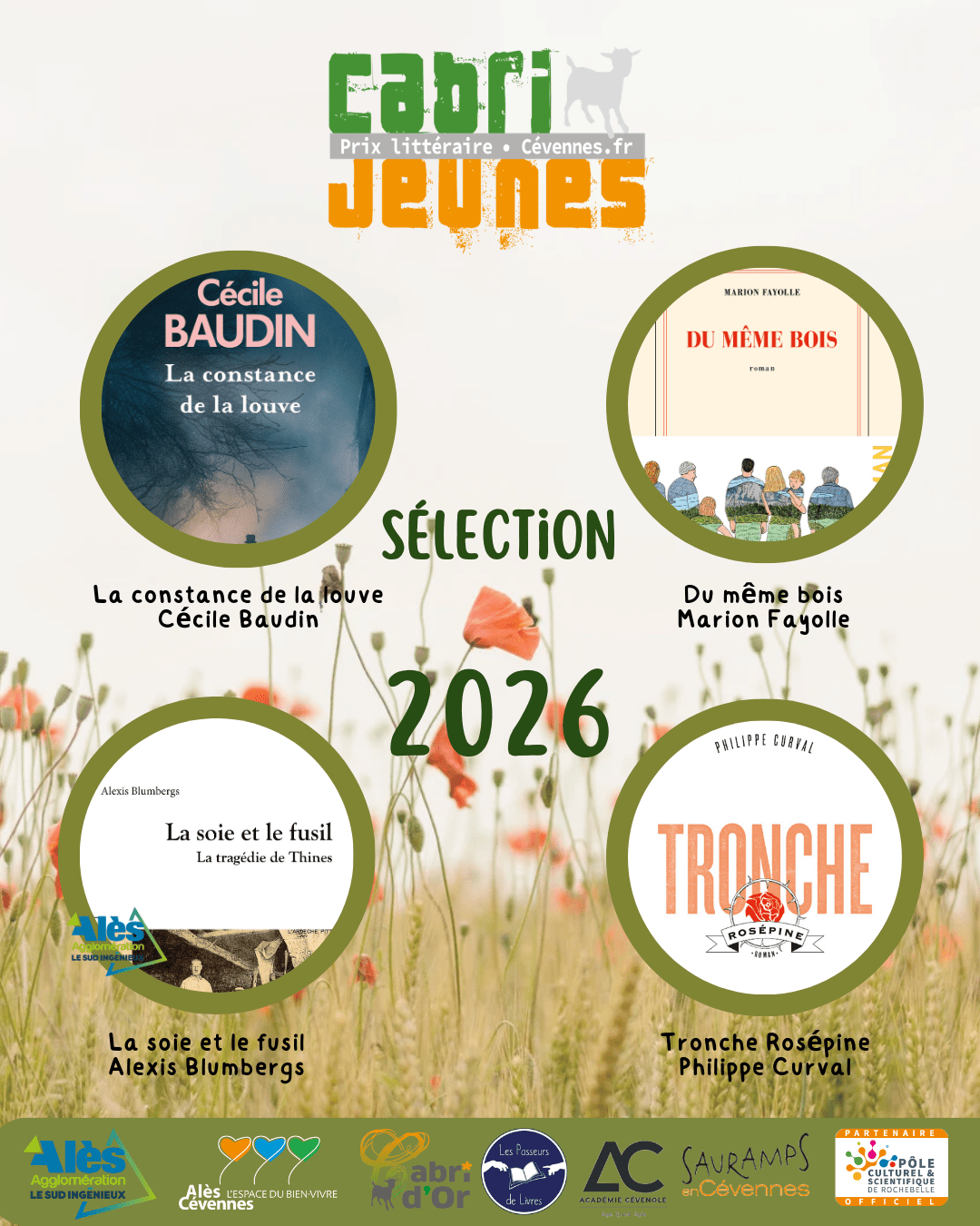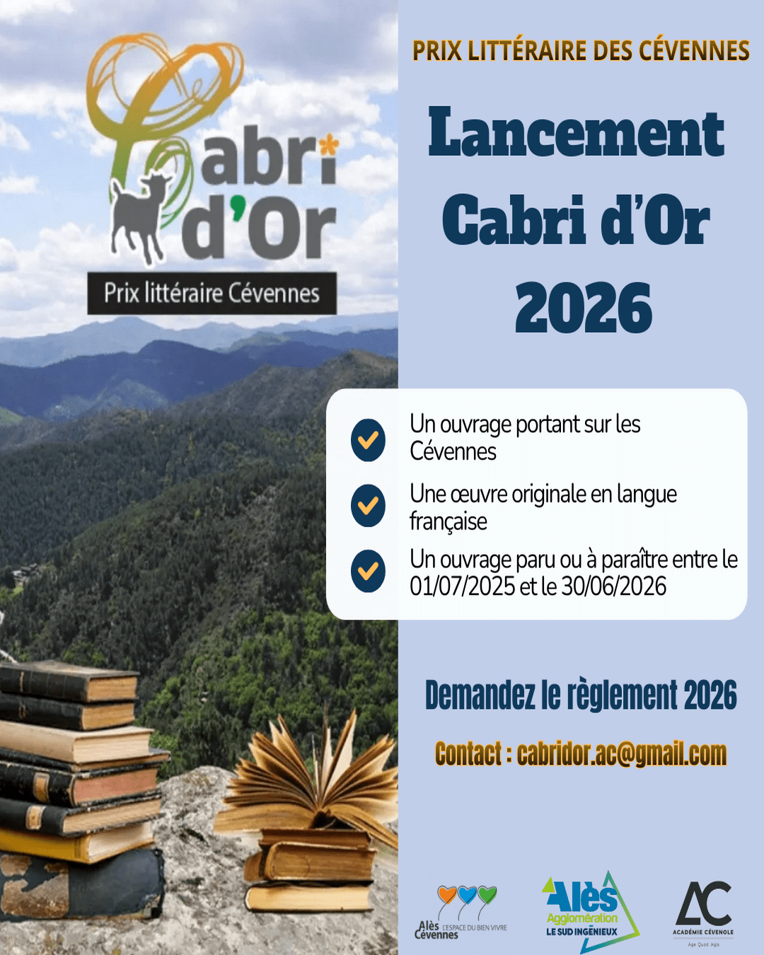 Le Prix Littéraire du Cabri d’Or récompense l’auteur d’un ouvrage romanesque, biographique, historique, artistique… qui porte sur la région des Cévennes. Il est attribué à une œuvre de fiction ou une œuvre documentaire dont le contenu a pour cadre le territoire cévenol.